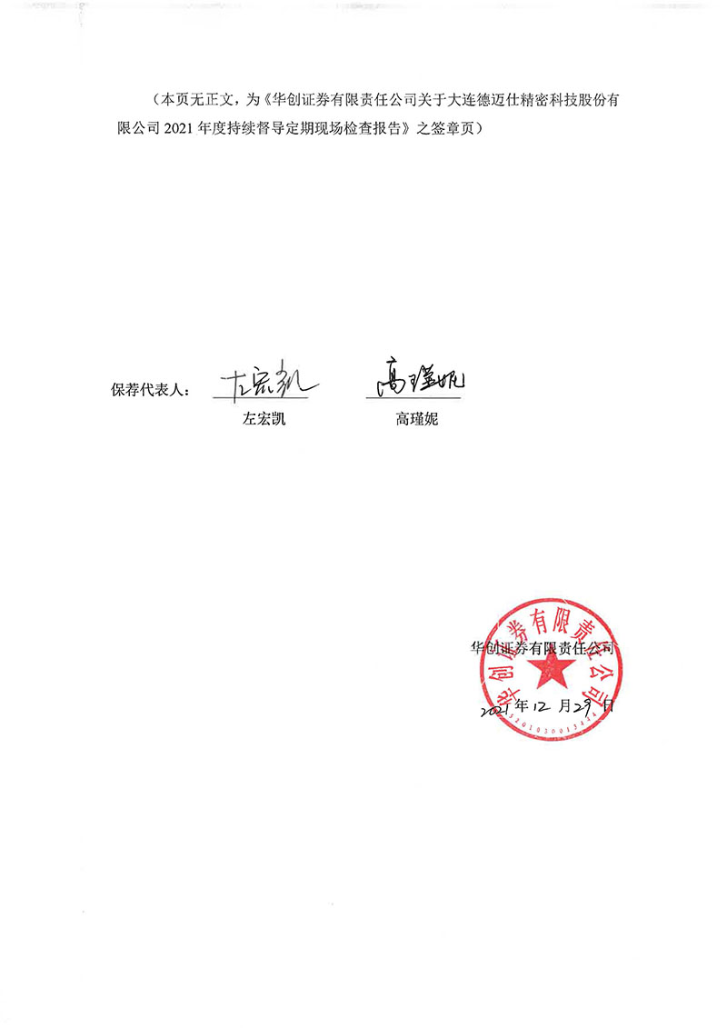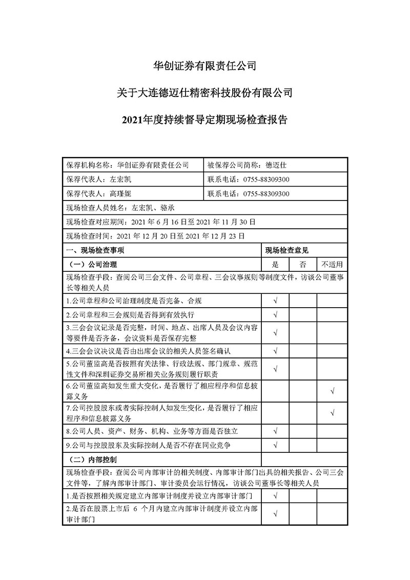 華創證券有限責任公司關于大連德邁仕精密科技股份有限公司2021年度持續督導定期現場檢查報告